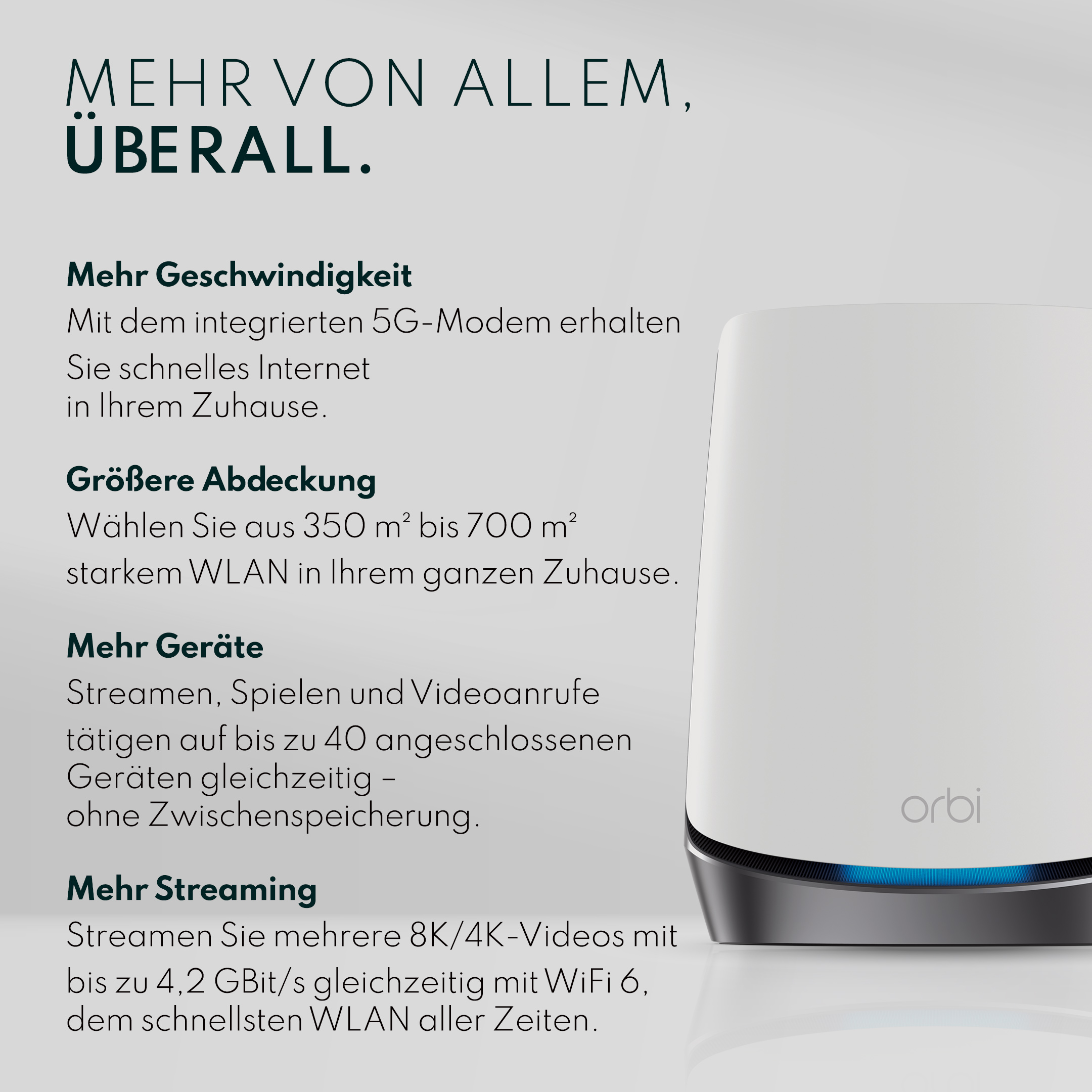 Der Orbi 5G Mesh-System bringt mobile 5G-Technologie in Ihr Zuhause und bietet bis zu 1 Gigabit Internetgeschwindigkeit. Abgedeckt werden bis zu 350m² Fläche mit blitzschneller, zuverlässiger WiFi 6-Technologie, die Geschwindigkeiten von bis zu 4,2 Gbit/s mit bis zu 40 Geräten bietet. Streamen, surfen und arbeiten Sie ununterbrochen in Ihrem ganzen Haus.