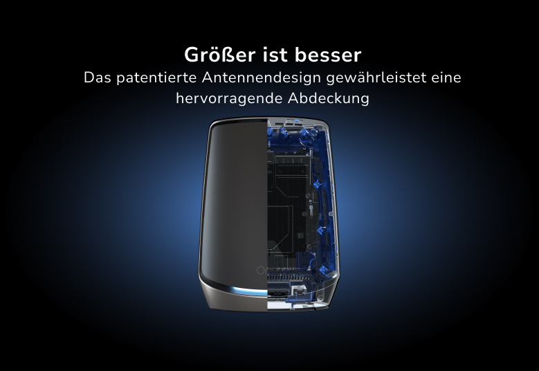 Die hohe, elegante Form von Orbi ist kein Zufall. Unter der Haube eines preisgekrönten Designs sorgt unser patentiertes Antennenarray für eine hervorragende WLAN-Abdeckung auf Ihrem gesamten Zuhause