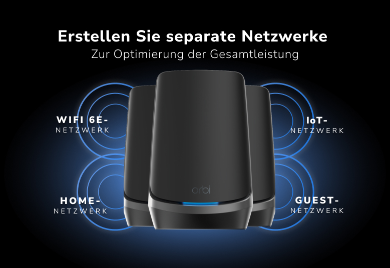 Mit dem Gast-WLAN-Netzwerk können Gäste ganz einfach einen separaten Internetzugang einrichten, und das Internet der Dinge (IoT) WLAN-Netzwerk kann verwendet werden, um Ihre IoT-Produkte wie Sicherheitskameras, Lautsprecher und digitale Assistenten zu verbinden und gleichzeitig Ihr Netzwerk zu schützen.