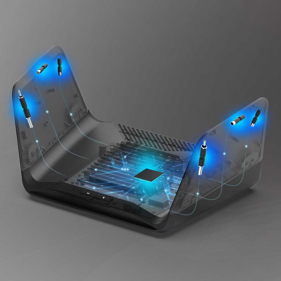 RAXE300 includes proprietary WiFi optimization and six optimally positioned antennas to deliver more capacity, stronger and more reliable connections, and less interference to your devices