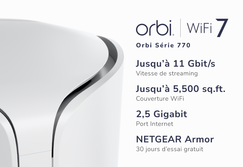 Avec la série Orbi 770, profitez d'une couverture parfaite dans toute la maison et d'une connectivité sécurisée pour travailler, streamer, jouer en ligne, et bien plus encore.
