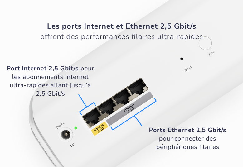 Un port Ethernet de 2,5 Gbit/s déverrouille la connexion Internet Multi-Gigabit pour votre maison. Bénéficiez d'une flexibilité optimale grâce à la connectivité LAN filaire 2,5 Gbit/s et aux vitesses WiFi multi-Gigabit.
