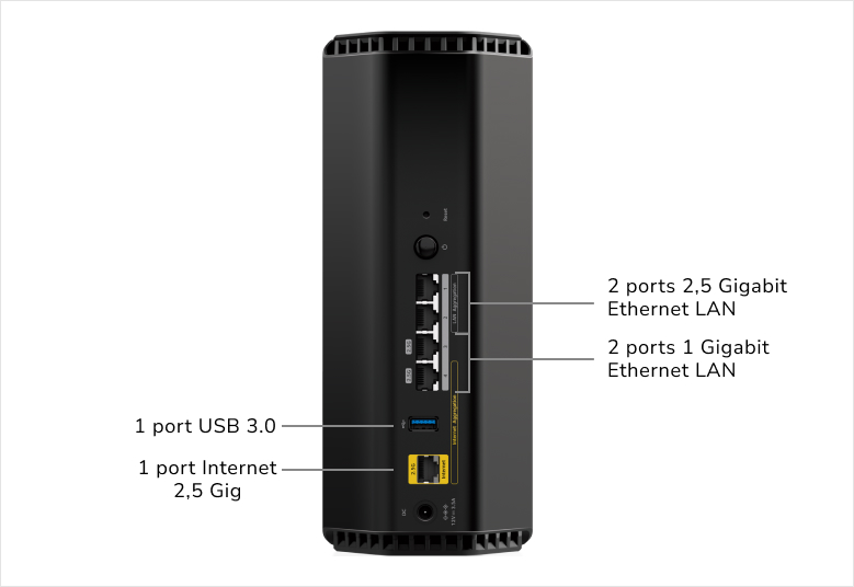 Avec un abonnement fibre, vous bénéficiez des vitesses les plus rapides disponibles aujourd'hui et demain grâce au port Internet 2,5 Gbit/s. 2.5Gbps§et les ports Ethernet 1Gbps libèrent une vitesse et une fiabilité imbattables pour les connexions filaires