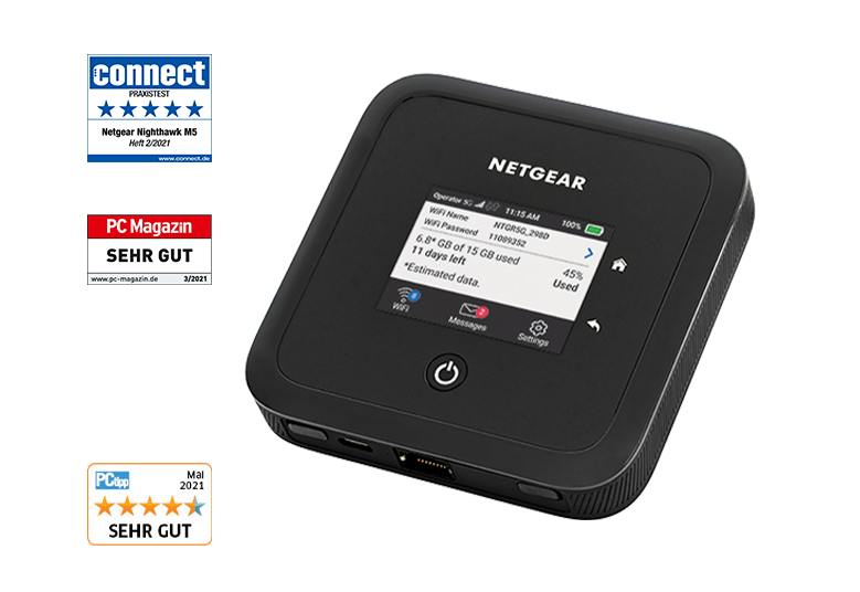 LEISTUNGSFÄHIGSTE WLAN-VERBINDUNG MIT 5G - der mobile Router Nighthawk M5 wird von der mobilen Plattform Snapdragon™ X55 von Qualcomm® angetrieben und bietet erstklassige Leistung und bahnbrechende Geschwindigkeiten*. Mit der neuesten WiFi 6-Technologie können Sie jederzeit und überall mehr Kapazität für angeschlossene Geräte nutzen. Das entsperrte Gerät akzeptiert alle Mobilfunkanbieter.