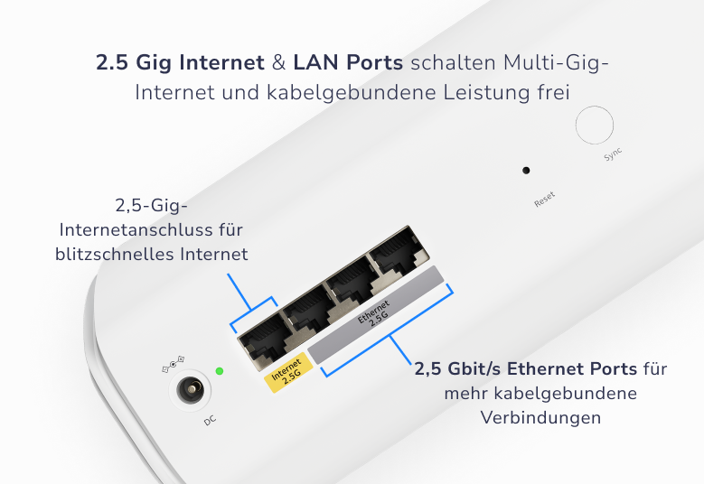 Ein 2,5-GB-Internet-Port schaltet das neueste Multi-Gig-Internet für Ihr Zuhause frei. Genießen Sie die ultimative Flexibilität mit 2,5-Gig-LAN-Konnektivität und Multi-Gig-WLAN-Geschwindigkeiten.