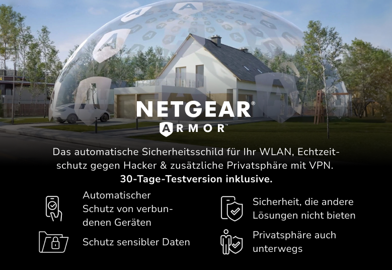 Powered by Bitdefender® – All-in-One-Internetsicherheit. NETGEAR Armor schützt das WLAN Ihrer Familie mit einem automatischen Sicherheitsschutzschild für Ihre PCs, Smartphones, Überwachungskameras und mehr. 30-Tage-Abonnement inbegriffen. Mehr Infos
