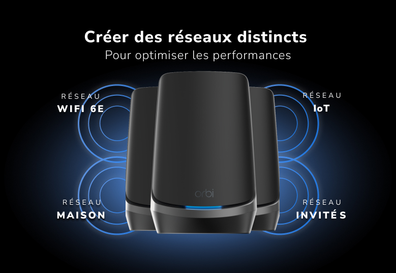 Créez facilement jusqu'à 4 réseaux distincts pour les périphériques WiFi 6E et les périphériques de maison connectée (IoT) afin d'optimiser le trafic réseau global.
