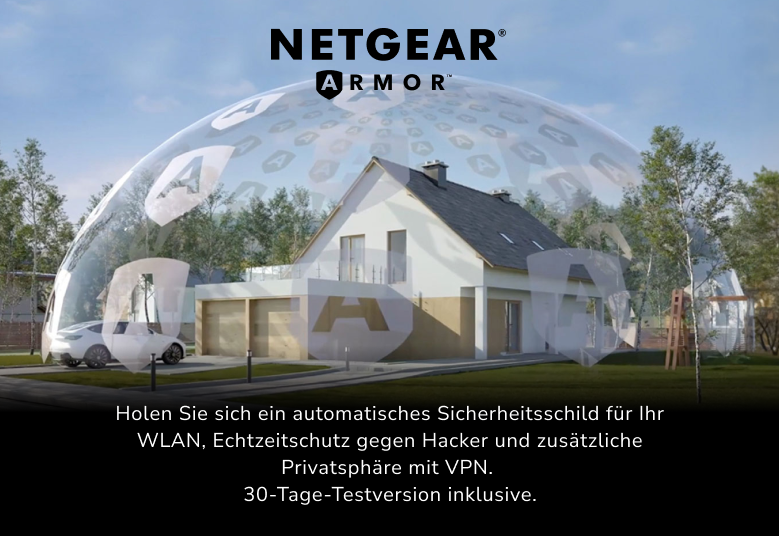 Die NETGEAR ArmorTM - Software bietet einen automatischen Schutz für Ihr WLAN und verbundene Geräte (PC, Telefon, Kamera, Fernseher usw.), um Echtzeitschutz zu gewährleisten. 30-Tage-Testversion inbegriffen