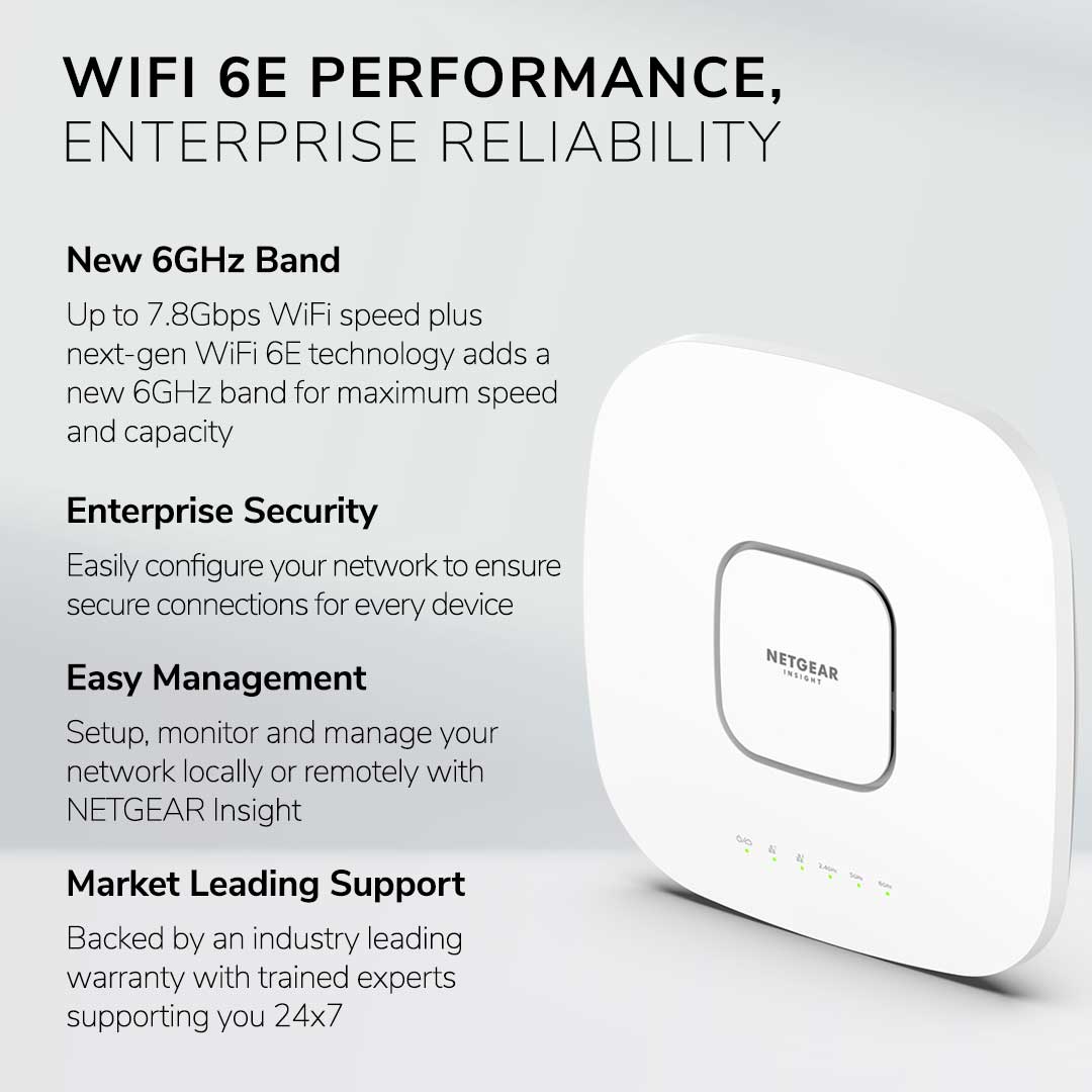 First Tri-Band WiFi 6E access point, WAX630EP is the most powerful SMB access point in the industry. With WiFi 6E, a new 6Ghz band added to WiFi 6 making it the fastest WiFi available. Offers the features and capabilities of WiFi 6 access points, including higher performance, lower latency, and faster data rates, and extends into the new 6 GHz band for expanded spectrum capacity.