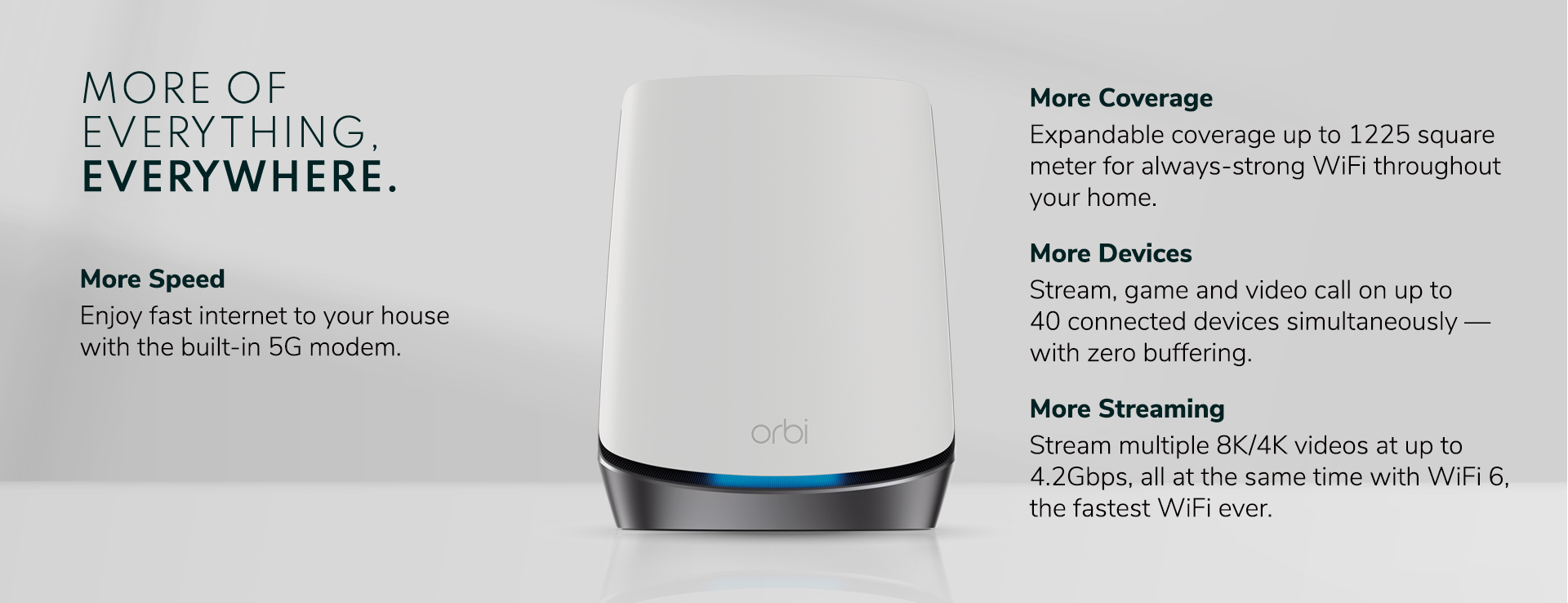 The Orbi 5G mesh system brings mobile 5G technology into your home and delivers up to 1 gigabit internet speed. Cover up to 350 m2 with blazing-fast, reliable WiFi 6 technology providing speeds of up to 4.2Gbps for up to 40 devices. Stream, browse and work uninterrupted throughout your home.