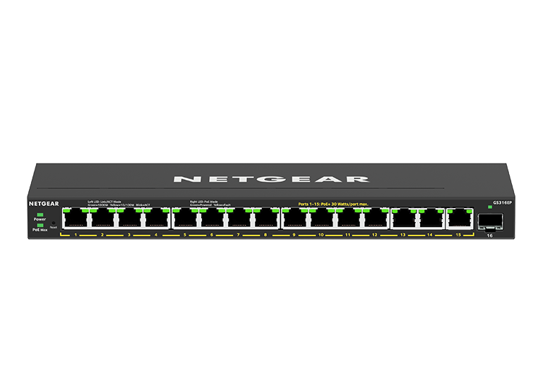 El switch Easy Smart Essentials PoE+ Gigabit Ethernet de 16 puertos de NETGEAR ofrece funciones esenciales de red empresarial y potencia dispositivos PoE+ como teléfonos VoIP, cámaras IP y más.