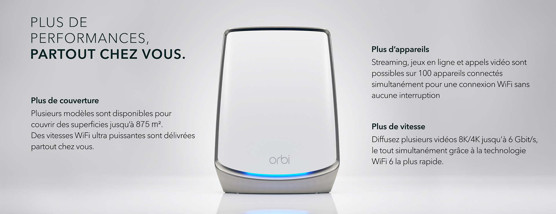 • Performances Wifi : WiFi Tri-bande AX6000 2,4 GHz (2 400 Mbit/s.†) + 5 GHz (2 400 Mbit/s.†) pour connecter les appareils Wifi à Internet Liaison Wifi 5 GHz (1 200 Mbit/s.†) dédiée pour une connexion de données plus rapide entre la base Orbi et le satellite Orbi