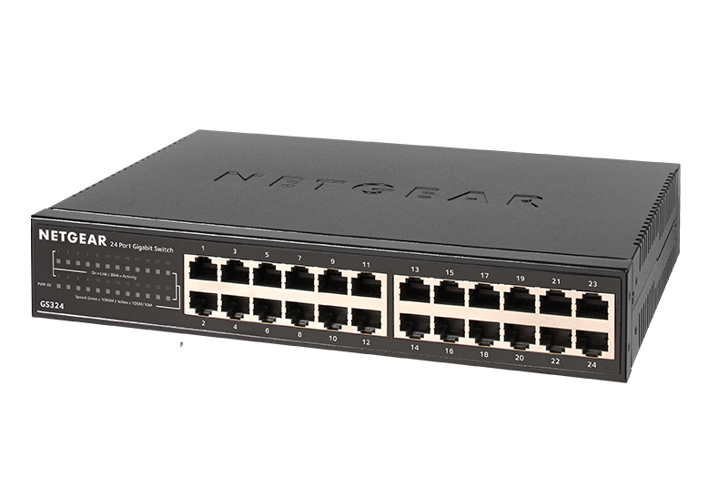 Switch NETGEAR Essentials con 24 porte Gigabit Ethernet. Questo switch è plug-and-play con porte non gestite che non richiedono alcuna configurazione aggiuntiva e prestazioni complete senza blocchi.