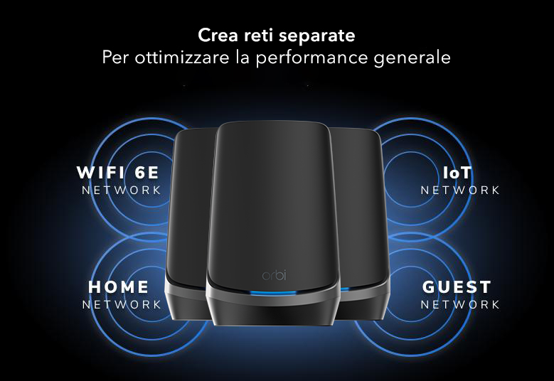 Crea facilmente fino a 4 reti separate per dispositivi WiFi 6E e per la tua casa intelligente (IoT) per ottimizzare il traffico di rete complessivo.