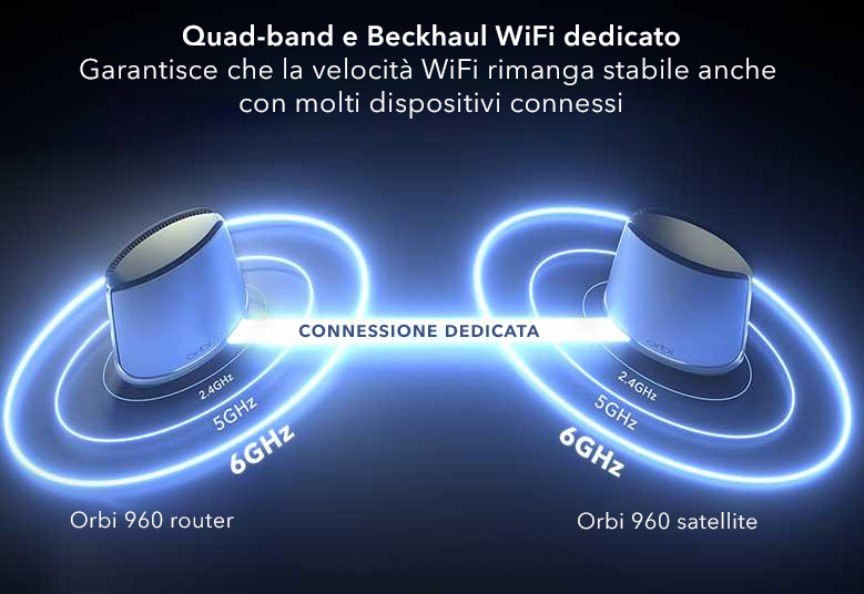 L'esclusiva tecnologia quad-band con backhaul dedicato garantisce velocità WiFi massime per un massimo di 200 dispositivi connessi