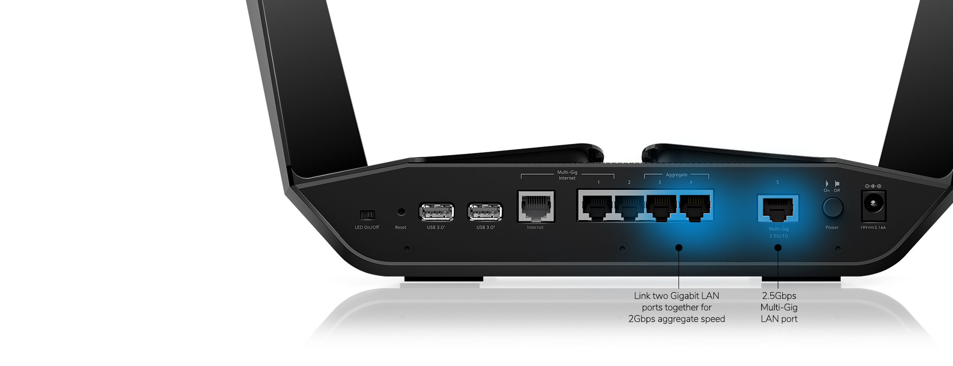 Utilizza la porta Ethernet 2,5G o l'aggregazione di collegamenti 2Gbps per inviare velocità Gigabit+ ai tuoi dispositivi più esigenti e collega ancora più dispositivi cablati alle quattro porte Gigabit Ethernet aggiuntive