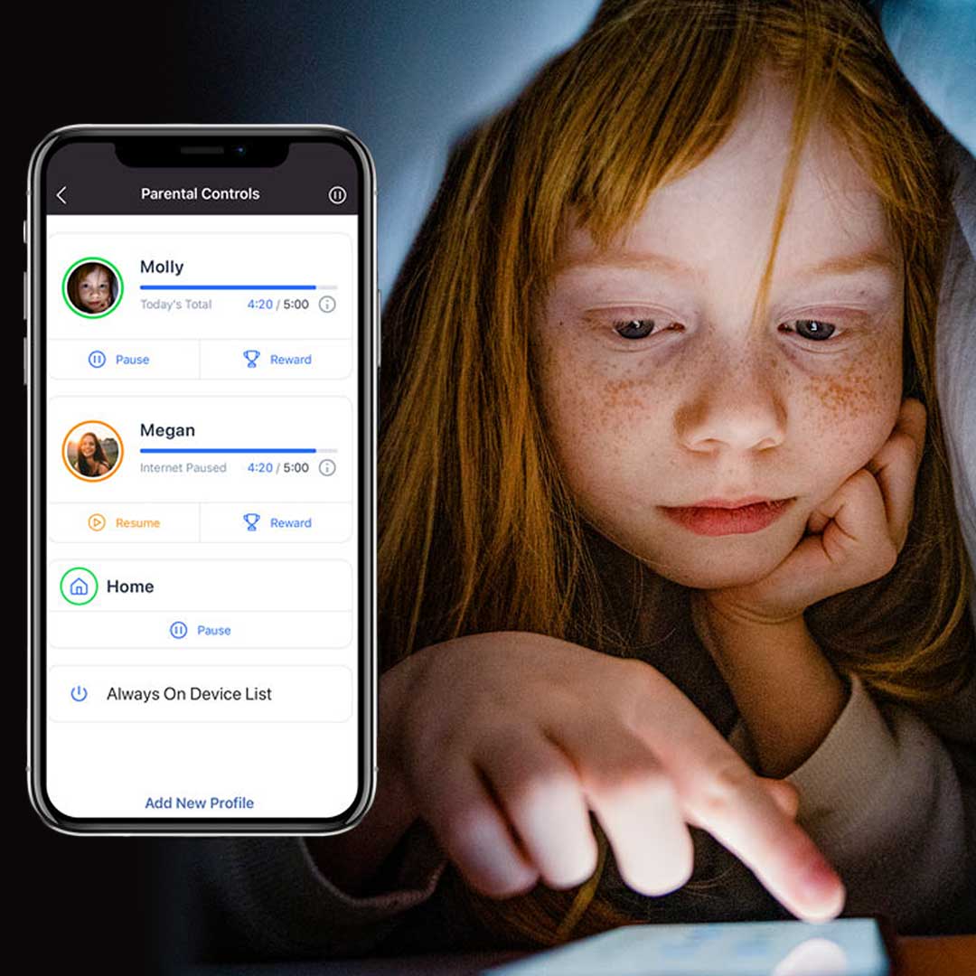 - NETGEAR Smart Parental Controls™: Consente di gestire facilmente il tempo trascorso online dai tuoi figli su tutti i dispositivi connessi