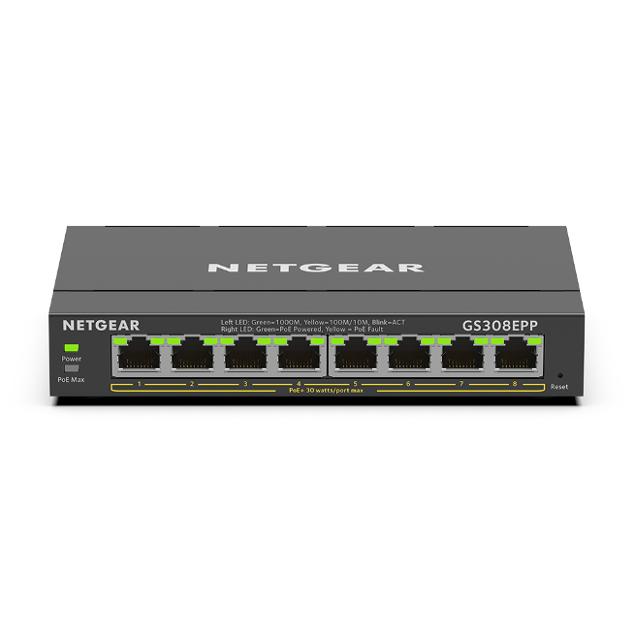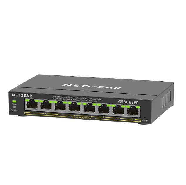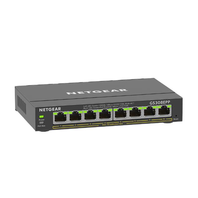 簡単なマネジメント機能と基本的なネットワーク機能を提供するアンマネージプラススイッチ。GS308EPPは、合計123WのPoE給電容量により、VoIP電話、IPカメラ、無線APなどのPoE受電デバイスに電力を供給します。