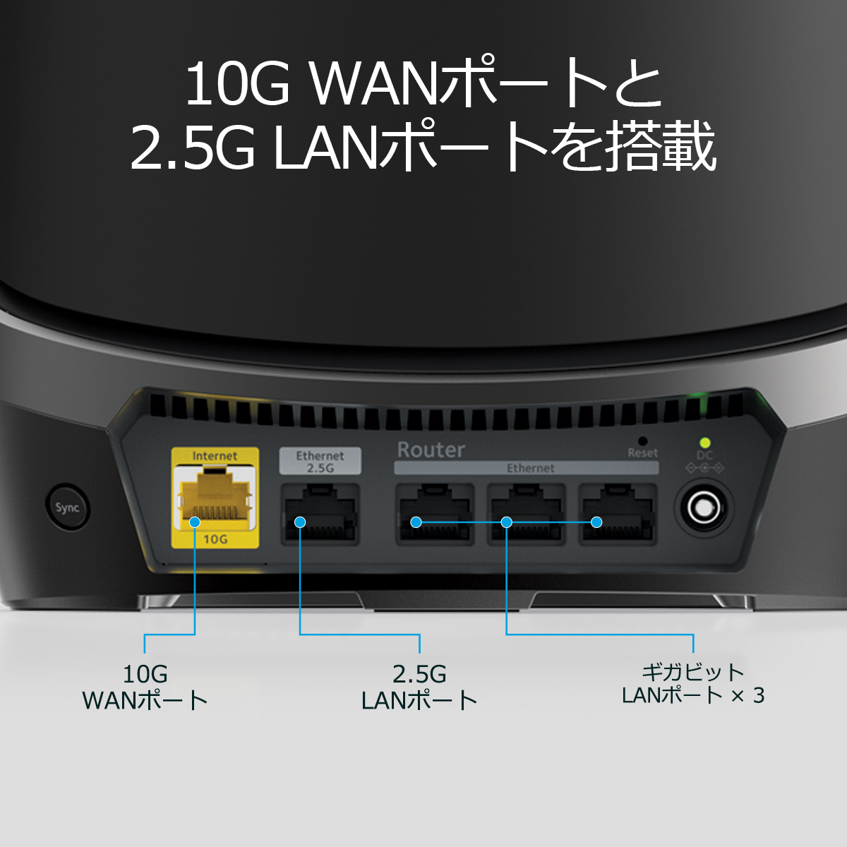 †IEEE 802.11仕様に基づく最大ワイヤレス信号速度。実際の通信速度はネットワークの通信状態や通信距離、障害物等の有無により低下することがあります。NETGEARは、本製品と将来標準化されるいかなる規格との互換性も保証しません。他の802.11ax 10.8Gbpsデバイスに接続すると、最大10.8Gbpsのワイヤレス速度が実現されます。