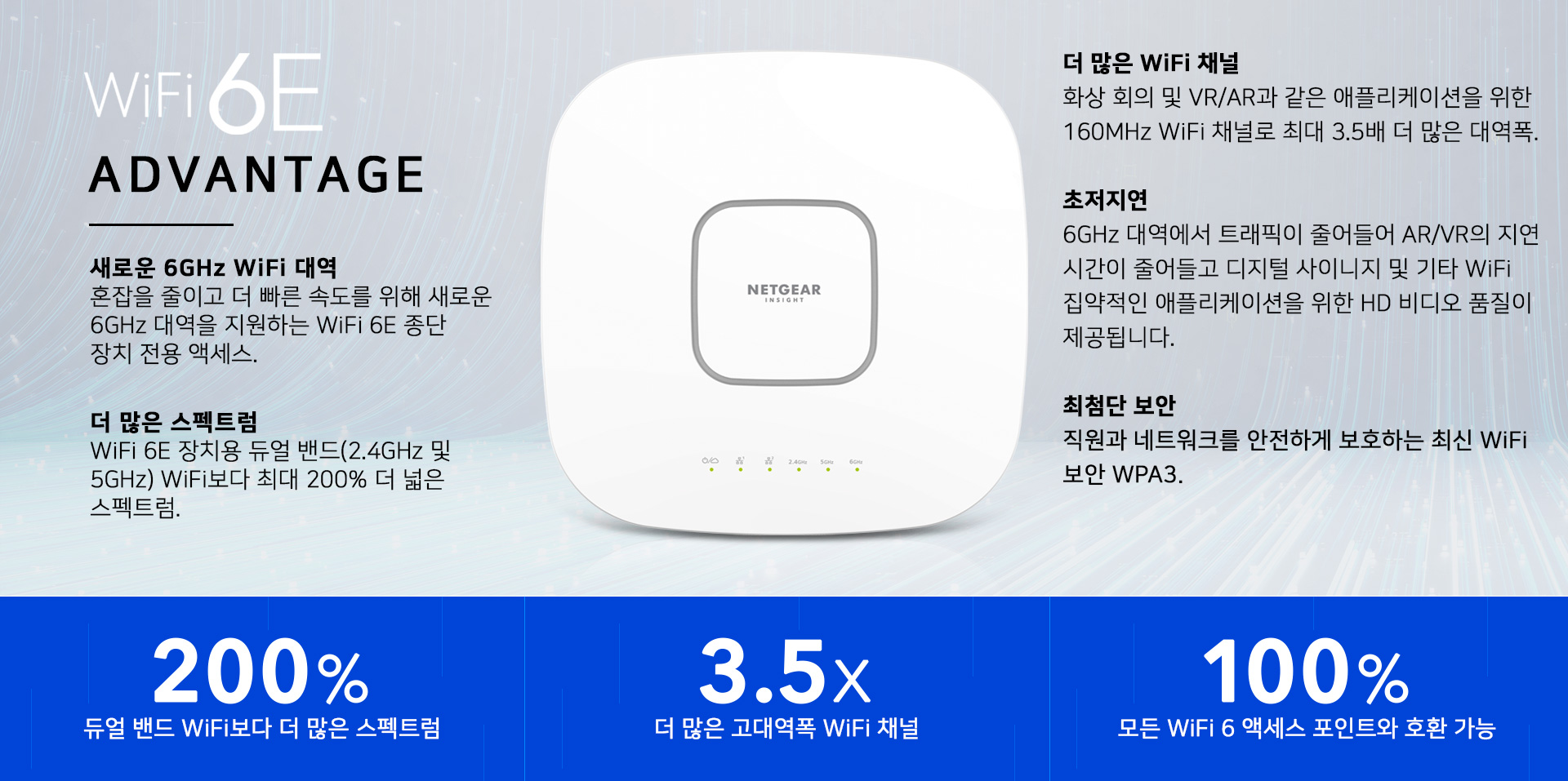 최신 WiFi 6E 기술로 최고 수준의 WiFi 속도와 성능으로 업그레이드하십시오. 새로운 6GHz 대역으로 속도, 연결 및 용량을 더욱 빠르게 향상하기 위해 WiFi 6E로 네트워크를 확장하십시오