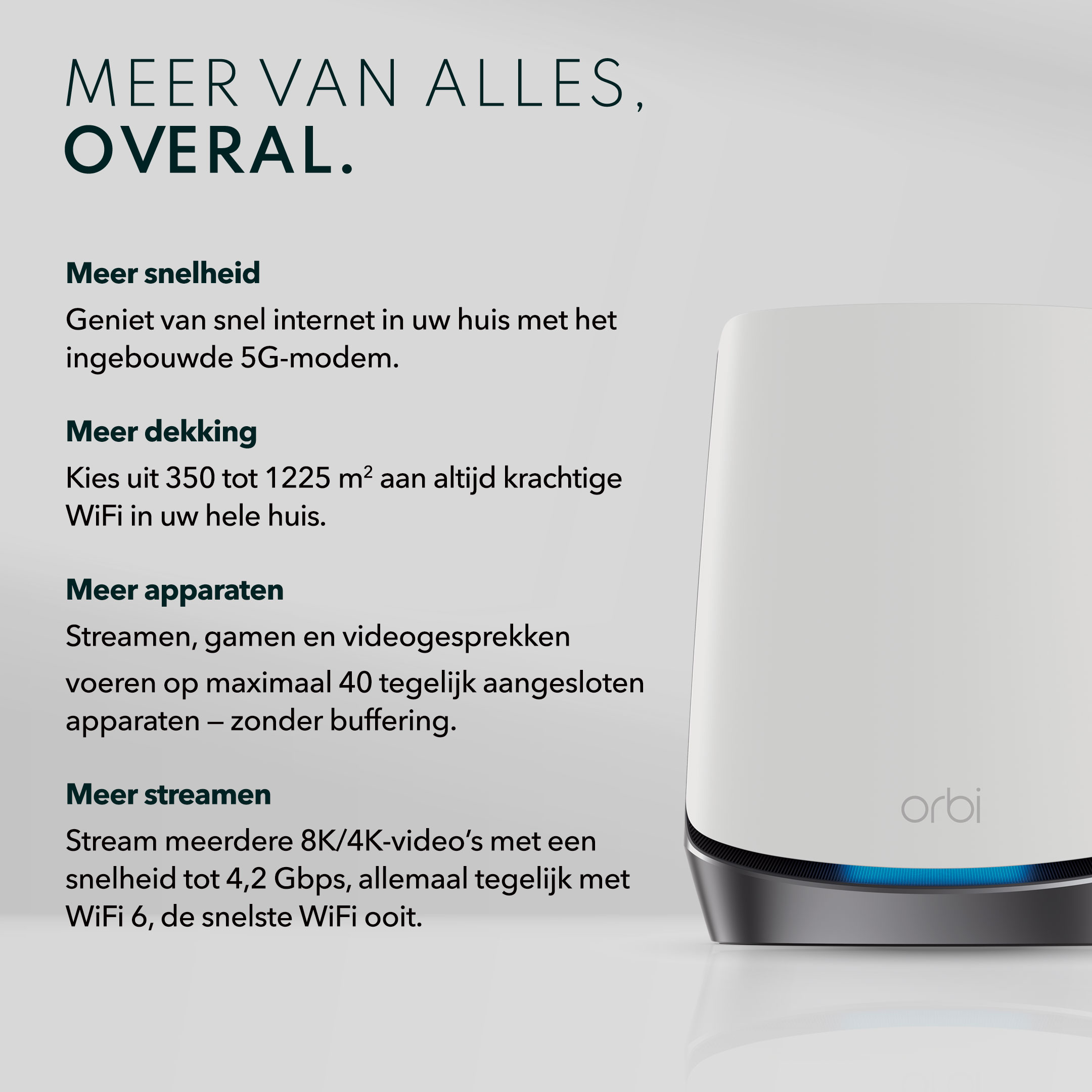 Voeg eenvoudig WiFi-dekking toe met extra satellieten – elk vergroot de dekking met 175 m2. (afzonderlijk verkrijgbaar)