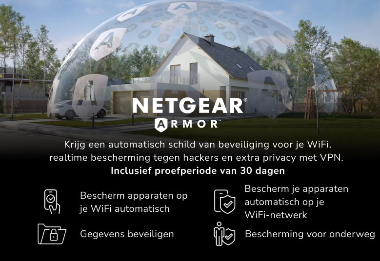 Alles-in-één internetbeveiliging. NETGEAR Armor™ beschermt de WiFi van uw gezin met een automatisch beveiligingsschild voor uw pc's, smartphones, beveiligingscamera's en meer. Inclusief abonnement van 30 dagen1
