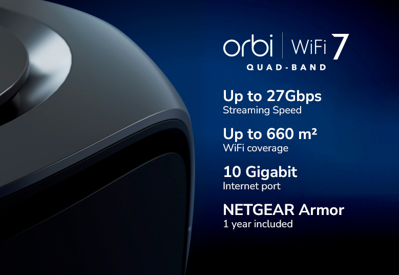 Orbi’s unique Enhanced Dedicated Backhaul combines patented Quad-Band with WiFi 7 technology to create a superhighway between router and satellites, ensuring better throughput at a wider range and consistent 10 Gig WiFi across your entire property.